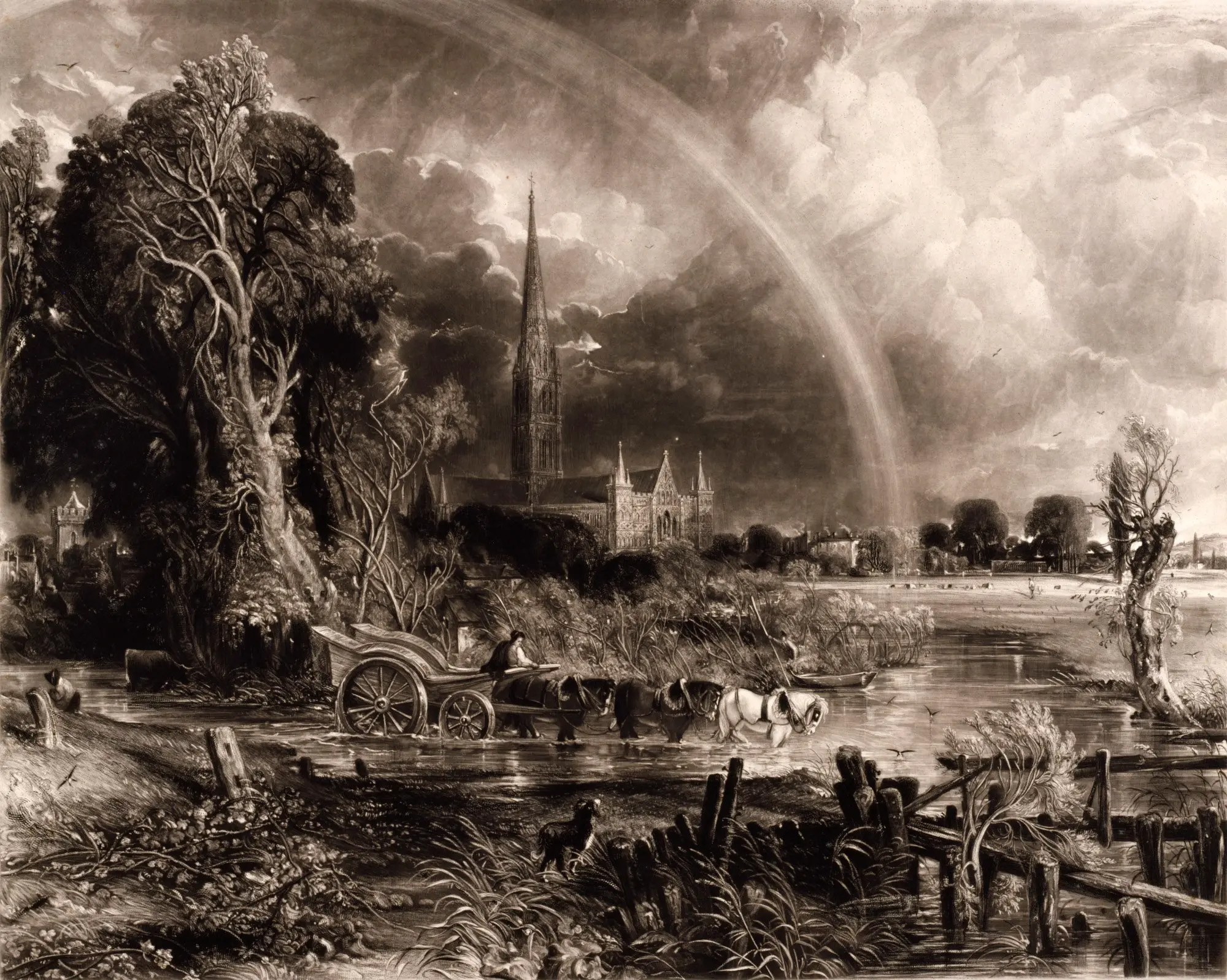 5 Salisbury Cathedral from the Meadows - Mezzotint 550 x 688mm by David Lucas after John Constable published Hodgson and Graves 20 March 1837 public domain image